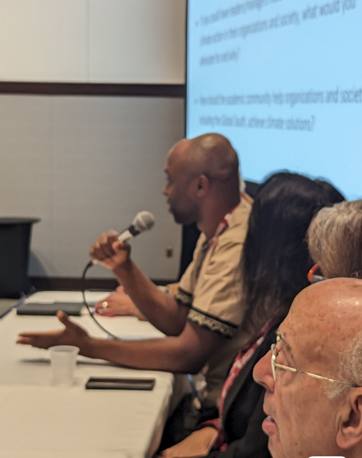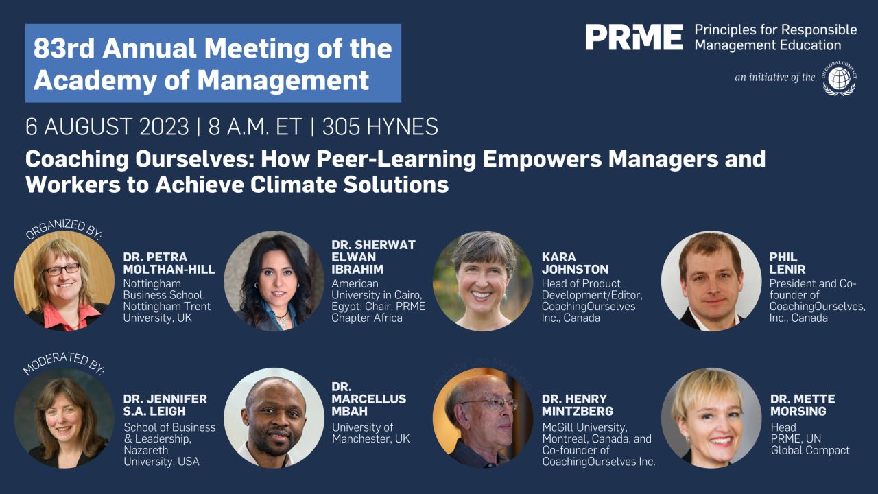 A symposium panellist discussing the subject “Coaching Ourselves: How Peer-Learning Empowers Managers and Workers to Achieve Climate Solutions” alongside Professor Petra Molthan-Hill, Professor Henry Mintzberg, Professor Mette Morsing and a few others at the Academy of Management Annual Meeting, Boston, Massachusetts, USA, 4-8 August, 2023.